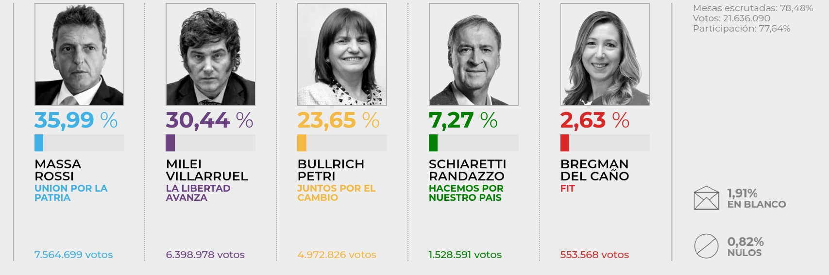 Milei se encuentra segundo, con el 30,39 por ciento.