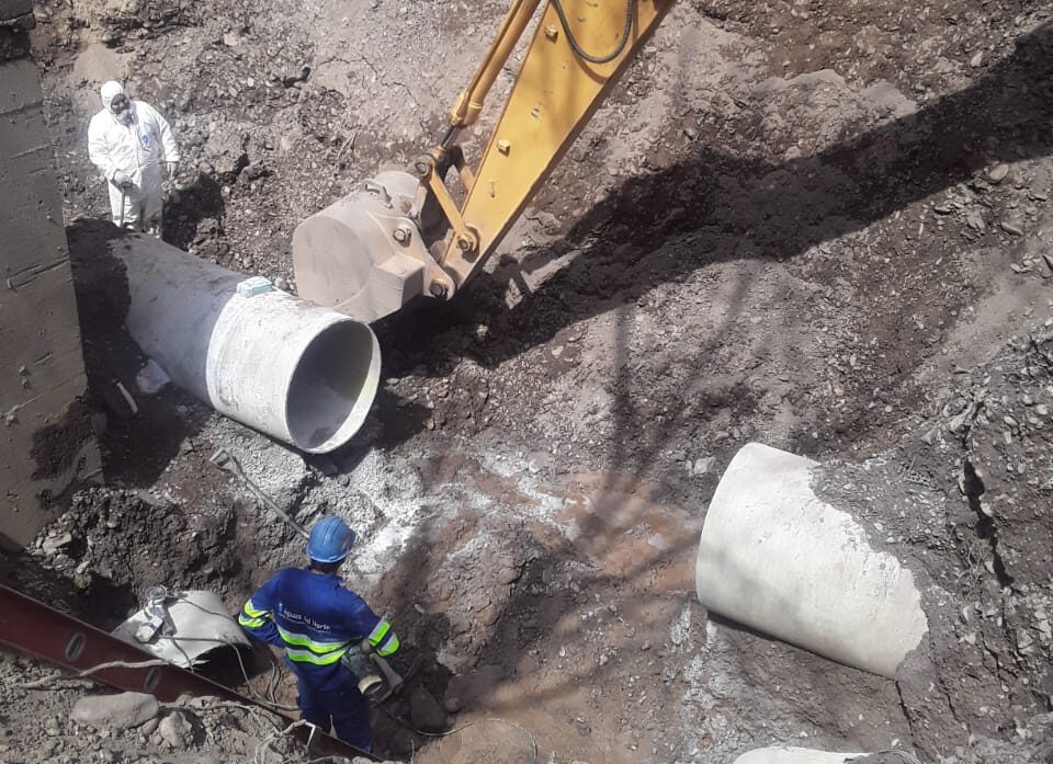 Varias cuadrillas de operarios de Aguas del Norte trabajan de manera continua para reparar un tramo del Acueducto Sur y restablecer el servicio en barrios de la zona sur, oeste y la localidad de Atocha.